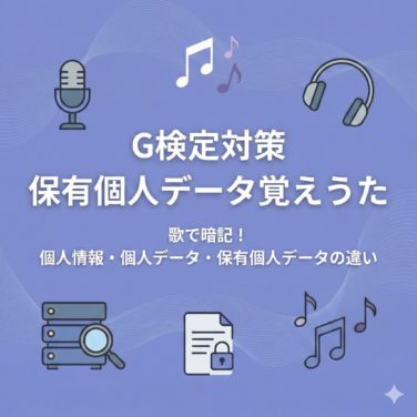 G検定の頻出用語「個人情報」「個人データ」「保有個人データ」の違いを、AI生成の「保有個人データ覚えうた」で楽しく暗記!引っかけ問題で狙われる「データの体系化」と「権限の有無」のポイントを初学者向けに分かりやすく解説。隙間時間の試験対策におすすめです。