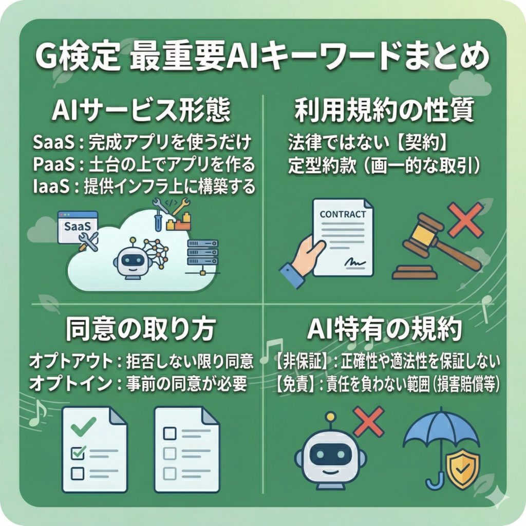 G検定の試験対策を進める中で、AIサービスの提供形態(クラウド)や利用規約(法律・倫理分野)の定義が覚えにくくて困った経験はありませんか。