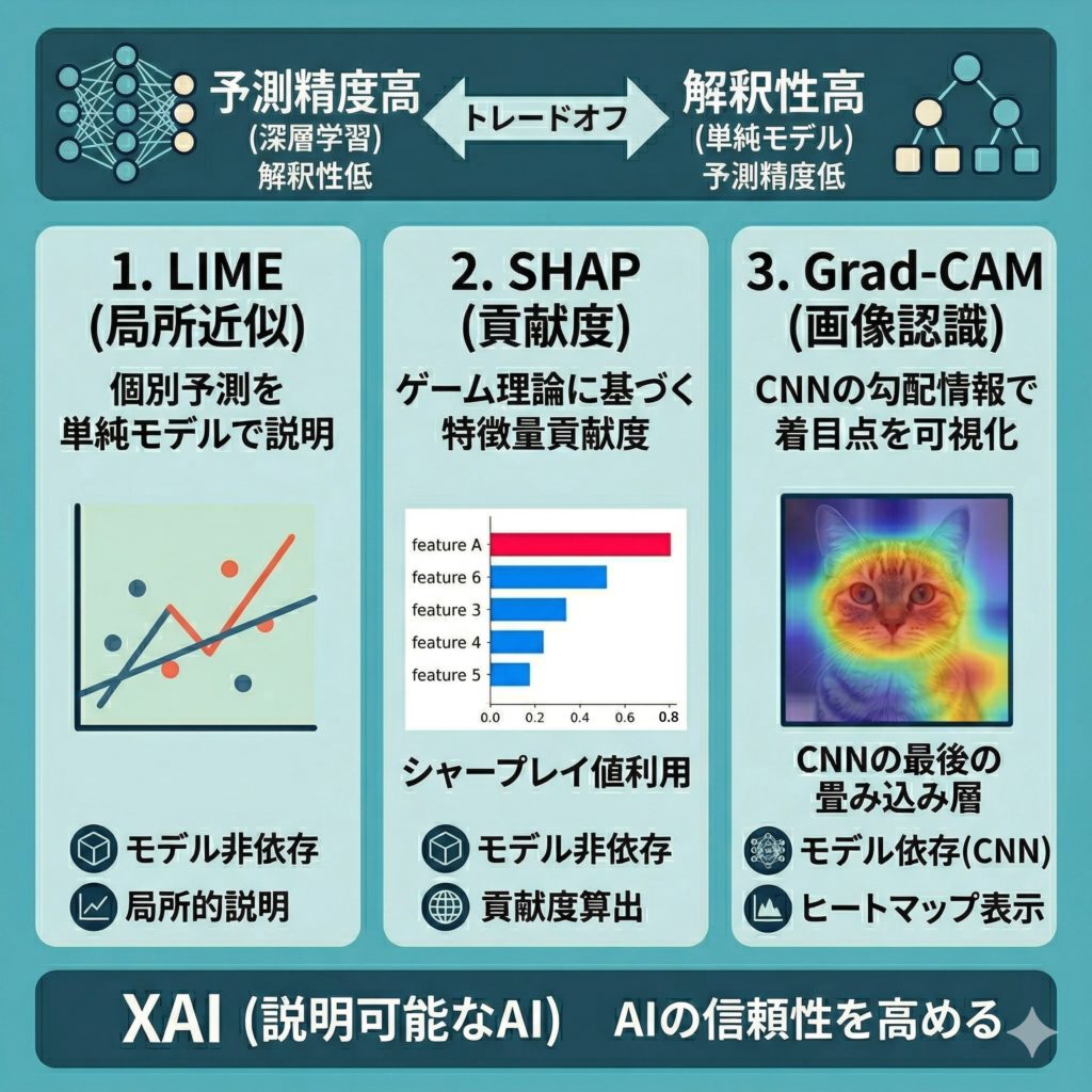 精度と解釈性のトレードオフや、LIME・SHAP・Grad-CAMの違いは、試験で頻出の超重要項目です。