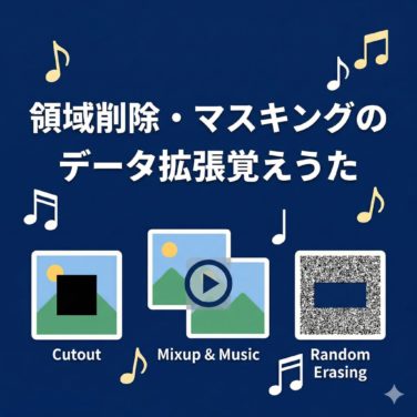 G検定対策の学習用ソング「領域削除・マスキングのデータ拡張覚えうた」を公開。Cutout、Random Erasing、Mixupの違いをAI音楽(Suno AI)のリズムで楽しく暗記できます。試験に出る重要ポイントと用語解説も掲載。合格を目指す方必見です。