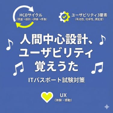 ITパスポート試験で頻出の「人間中心設計」や「ユーザビリティ」の違いを、AI作成の「人間中心設計、ユーザビリティ覚えうた」で楽しく攻略!GeminiとSuno AIが生み出したリズムに乗せて、紛らわしい用語を効率よく暗記できる試験対策記事です。